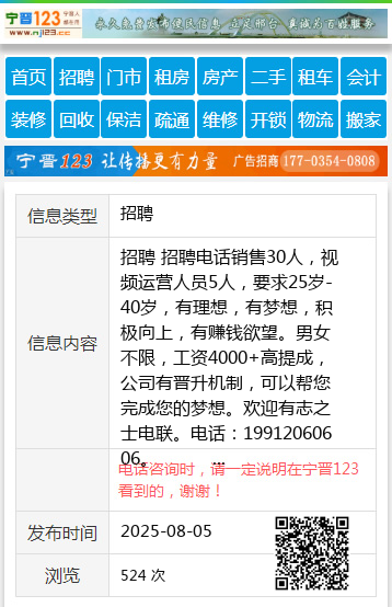 招聘 招聘电话销售30人,视频运营人员5人,要求25岁-40岁,有理想,有梦想,积极向上,有赚钱欲望。男女不限,工资4000+高提成,公司有晋升机制,可以帮您完成您的梦想。欢迎有志之士电联。电话:19912060606。 聘