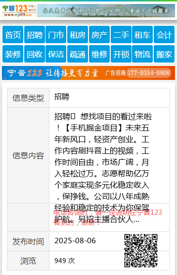 招聘 想找项目的看过来啦!【手机掘金项目】未来五年新风口,轻资产创业。工作内容刷抖音上的视频,工作时间自由,市场广阔,月入轻松过万。志愿帮助亿万个家庭实现多元化稳定收入,保挣钱。公司以八年成熟经验和稳定的技术为你保驾护航。另招主播合伙人期待您的加入招聘16630900544 聘