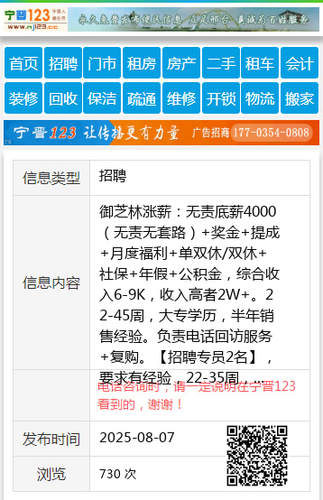 御芝林涨薪:无责底薪4000(无责无套路)+奖金+提成+月度福利+单双休/双休+社保+年假+公积金,综合收入6-9K,收入高者2W+。22-45周,大专学历,半年销售经验。负责电话回访服务+复购。【招聘专员2名】,要求有经验,22-35周,综合收入3.5-7.5K。地址:银座+开发区科技园+南和。电话:15131955612 / 19831922029 |
