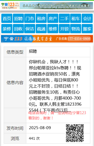 你缺机会,我缺人才!!!邢台帕蒂亚拉ktv急聘!!现招聘酒水促销员50名,漂亮小姐姐优先,每日保底800元上不封顶,日结日结!!招聘服务生10名,有责任心小哥哥优先,月薪4000-7000元。联系人韩主管18233965544(下午两点以后联系)