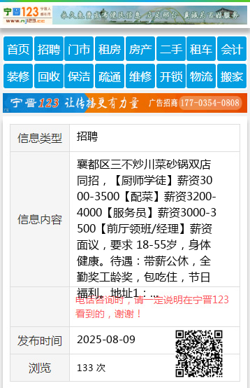 襄都区三不炒川菜砂锅双店同招,【厨师学徒】薪资3000-3500【配菜】薪资3200-4000【服务员】薪资3000-3500【前厅领班/经理】薪资面议,要求 18-55岁,身体健康。待遇:带薪公休,全勤奖工龄奖,包吃住,节日福利。地址1:襄都区西门里街号楼1号门市地址2:襄都区龙泉东大街富泉花园3号门市三不炒万泉汇店电话:15003392221 |