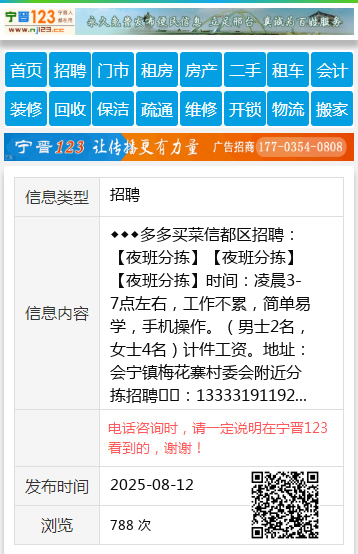 ◆◆◆多多买菜信都区招聘: 【夜班分拣】【夜班分拣】【夜班分拣】时间:凌晨3-7点左右,工作不累,简单易学,手机操作。(男士2名,女士4名)计件工资。地址:会宁镇梅花寨村委会附近分拣招聘☎️:13333191192