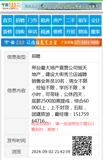 邢台最大地产直营公司恒天地产,建设大街秀兰店诚聘销售业务员10名,男女不限,经验不限,学历不限,8小时,可带娃,公休四天,底薪2500加高提成,综合6000以上,上不封顶,五险,团建旅游,夏经理:15175964716