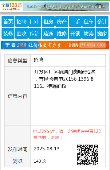 开发区厂区招聘门岗师傅2名,有经验者电联156 1396 8116。待遇面议