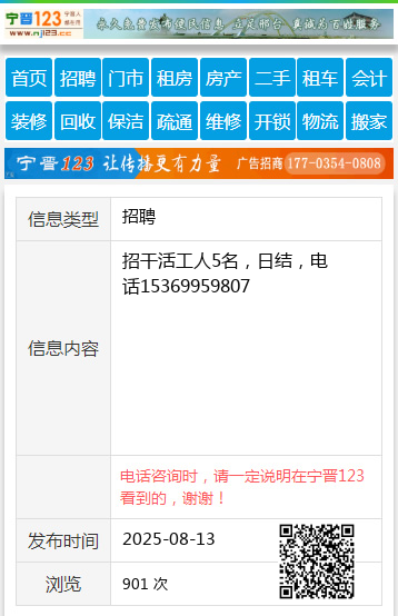 招干活工人5名,日结,电话15369959807