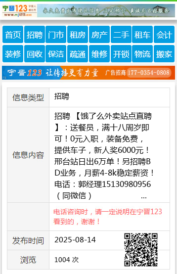 招聘 【饿了么外卖站点直聘】:送餐员,满十八周岁即可!0元入职,装备免费,提供车子,新人奖6000元!邢台站日出6万单!另招聘BD业务,月薪4-8k稳定薪资!电话:郭经理15130980956(同微信) 聘