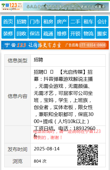 招聘 【光启传媒】招募:抖音弹幕游戏解说主播,无需会游戏,无需颜值、无需才艺,可居家可公司坐班,宝妈,学生,上班族,创业者,实体老板,限女性,兼职和全职都可,保底3000+提成(人均10k以上)工资日结。电话:18932960607(微信同)13250001307(微信同)地址:万达广场对面 聘