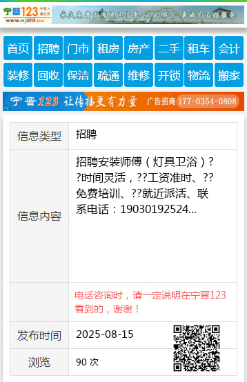 招聘安装师傅(灯具卫浴)??时间灵活,??工资准时、??免费培训、??就近派活、联系电话:19030192524