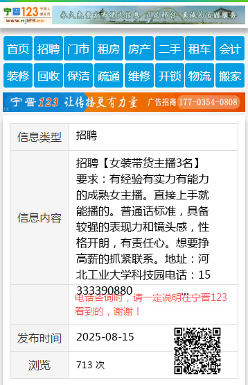 招聘【女装带货主播3名】要求:有经验有实力有能力的成熟女主播。直接上手就能播的。普通话标准,具备较强的表现力和镜头感,性格开朗,有责任心。想要挣高薪的抓紧联系。地址:河北工业大学科技园电话:15333390880 聘