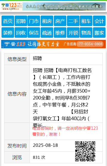 招聘 招聘【电商打包工数名】(长期工),工作内容打包观赏小金鱼,不抵触水的女工年龄45内,月薪3500+200全勤,时间早8点30到7点,中午管午餐,月公休2天 【另招封袋打氧女工】年龄40以内(要长期),月工资2600,无公休,时间早9点到12点,下午2点到6点准点下班 。 电话15226818063,地址团结路与滨江路交叉口团结路往西走,顺隆种植园内 聘 |