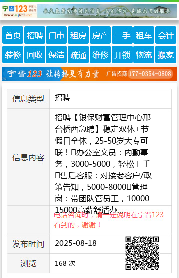 | 信息内容 | 招聘【银保财富管理中心邢台桥西急聘】稳定双休+节假日全休,25-50岁大专可联!✅办公室文员:内勤事务,3000-5000,轻松上手✅售后客服:对接老客户/政策告知,5000-8000✅管理岗:带团队管员工,10000-15000高薪舒适办公环境,无加班压力,家门口的好工作!咨询:18631995567 / 13739695355 聘 |