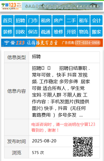 招聘 招聘日结兼职 .常年可做, 快手 抖音 发视频. 工作稳定 多劳多得 居家可做 适合所有人,学生党 宝妈 不限人群 不限人数 工作内容:手机发图片(我提供图片) 快手,抖音 (无任何套路费用 ) 多号多发 几分钟即可发完,收入30-200元不等,今天发,明天结账,(另招团队,团长收入3-4位数)诚信合作 有意联系v➕_1iIiIiIiI77v➕ jingteng158qq➕53922086 聘 |