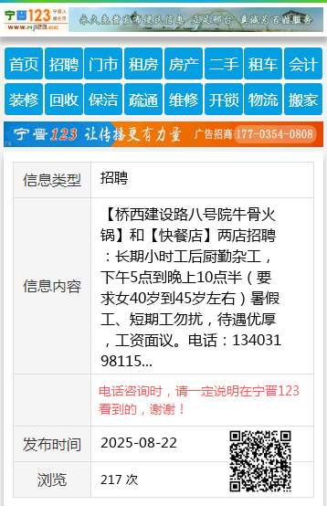 【桥西建设路八号院牛骨火锅】和【快餐店】两店招聘:长期小时工后厨勤杂工,下午5点到晚上10点半(要求女40岁到45岁左右)暑假工、短期工勿扰,待遇优厚,工资面议。电话:13403198115