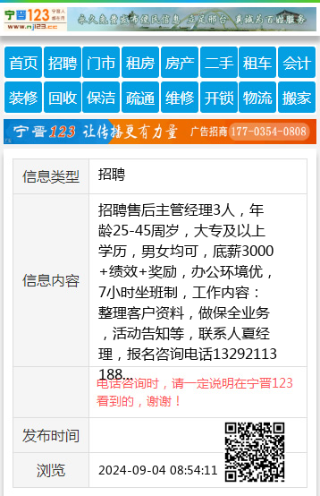 招聘售后主管经理3人,年龄25-45周岁,大专及以上学历,男女均可,底薪3000+绩效+奖励,办公环境优,7小时坐班制,工作内容:整理客户资料,做保全业务,活动告知等,联系人夏经理,报名咨询电话13292113188
