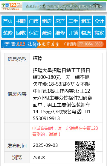 招聘大量招聘日结工工资日结100-180元一天一结不拖欠年龄:18-53周岁男女不限中间管1餐工作内容:女工12元/小时主要分拣摆件扫码翻面单,男工主要倒包装卸车14-15元/小时报名电话☎️15530919913 聘