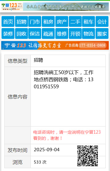 招聘洗碗工50岁以下,工作地点桥西钢铁路;电话:13011951559