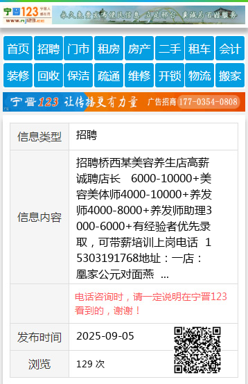 招聘桥西某美容养生店高薪诚聘店长 6000-10000+美容美体师4000-10000+养发师4000-8000+养发师助理3000-6000+有经验者优先录取,可带薪培训上岗电话 15303191768地址:一店:凰家公元对面燕 云台底商 二店:八一路四幼西侧 聘