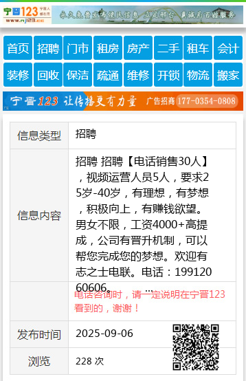 招聘 招聘【电话销售30人】,视频运营人员5人,要求25岁-40岁,有理想,有梦想,积极向上,有赚钱欲望。男女不限,工资4000+高提成,公司有晋升机制,可以帮您完成您的梦想。欢迎有志之士电联。电话:19912060606。 聘