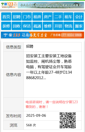 招安装工主要安装工地设备如监控、闸机扬尘等,熟悉电脑,有驾驶证会开车驾龄一年以上年龄27-48岁☎13488682012