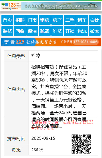 招聘招带货(保健食品)主播20名,男女不限,年龄30至50岁,特别优秀年龄可放宽。抖音直播平台,全提成模式,提成为销售额的30%,一天销售上万元很轻松,周结佣。一场两小时,一天播两场,全天24小时选自己适合的时间段播亦可回家播。直播采用电脑,按着稿子念就行,简单好学。地址:新世纪西侧优米孵化基地负一层,电话:13343192918 聘 |