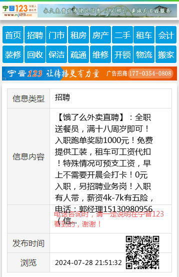【饿了么外卖直聘】:全职送餐员,满十八周岁即可!入职跑单奖励1000元!免费提供工装,租车可工资代扣!特殊情况可预支工资,早上不需要开晨会打卡!0元入职,另招聘业务岗!入职有人带,薪资4k-7k有五险,电话:郭经理15130980956(信)