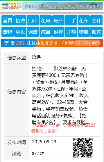 招聘 御芝林涨薪:无责底薪4000(无责无套路)+奖金+提成+月度福利+单双休/双休+社保+年假+公积金,综合收入6-9K,收入高者2W+。22-45周,大专学历,半年销售经验。负责电话回访服务+复购。【招聘专员2名】,要求有经验,22-35周,综合收入3.5-7.5K。地址:银座+开发区科技园+南和。电话:15131955612 / 19831922029 聘 |