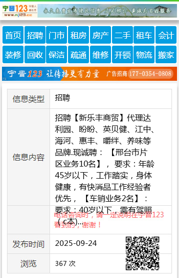 招聘【新乐丰商贸】代理达利园、盼盼、英贝健、江中、海河、惠丰、嚼绊、养味等品牌.现诚聘: 【邢台市片区业务10名】, 要求:年龄45岁以下,工作踏实,身体健康,有快消品工作经验者优先, 【车销业务2名】: 要求:40岁以下,需有驾照(c本),一年以上驾驶经验; 以上业务, 薪资:3500-5000+绩效+提成,正式录用可入保险; 电话:13643298772,13831986012 聘 |