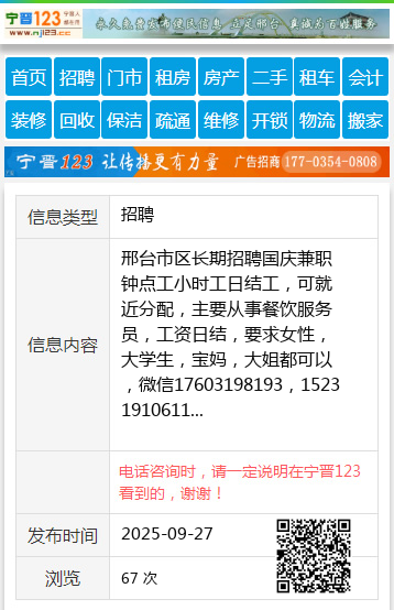 邢台市区长期招聘国庆兼职钟点工小时工日结工,可就近分配,主要从事餐饮服务员,工资日结,要求女性,大学生,宝妈,大姐都可以,微信17603198193,15231910611