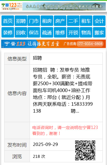 招聘招 聘:发单专员 地推专员,全职。薪资:无责底薪2500+300满勤奖+提成带面包车司机4000+油补工作地点:邢台(就近分配)月休两天联系电话:15833399138 聘