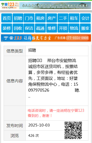 招聘 邢台市安能物流诚招市区送货司机,按票结算,多劳多得,有经验者优先,工资面议,地址:好望角保税物流中心,电话:15097970526 聘