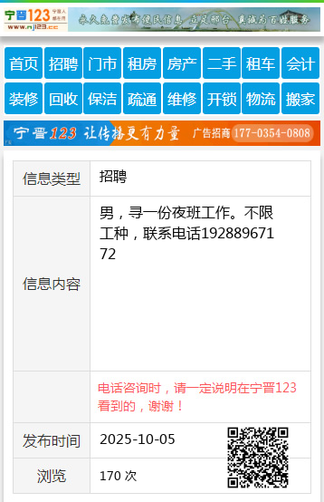 男,寻一份夜班工作。不限工种,联系电话19288967172
