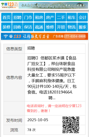 招聘 信都区浆水镇【食品厂招女工】,邢台珠联食品科技有限公司刚投产现急需大量女工,要求55周岁以下,手脚麻利身体健康。日工90元计件100-140元/天,包食宿。电话18203194664. 聘