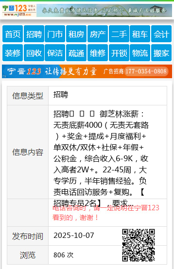 招聘 御芝林涨薪:无责底薪4000(无责无套路)+奖金+提成+月度福利+单双休/双休+社保+年假+公积金,综合收入6-9K,收入高者2W+。22-45周,大专学历,半年销售经验。负责电话回访服务+复购。【招聘专员2名】,要求有经验,22-35周,综合收入3.5-7.5K。地址:银座+开发区科技园+南和。电话:15131955612 / 19831922029 聘 |