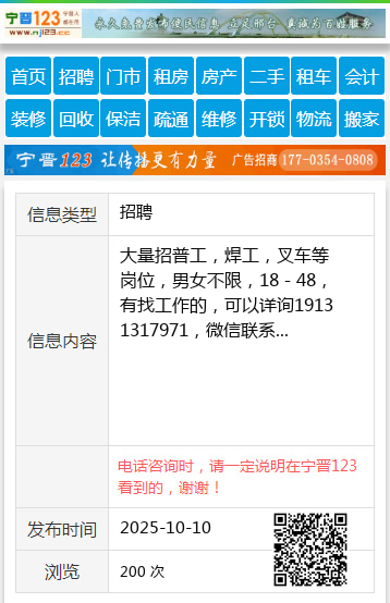 大量招普工,焊工,叉车等岗位,男女不限,18-48,有找工作的,可以详询19131317971,微信联系