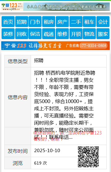 招聘 桥西机电学院附近急聘!!!全职带货主播,男女不限,年龄不限,需要有带货经验、表现力好,工资保底5000,综合10000+,提成上不封顶。另外招锻炼主播,可无直播经验。需要空闲时间多,能稳定长期干,兼职勿扰,随时可来公司面试!!联系电话:17692970852同微 聘