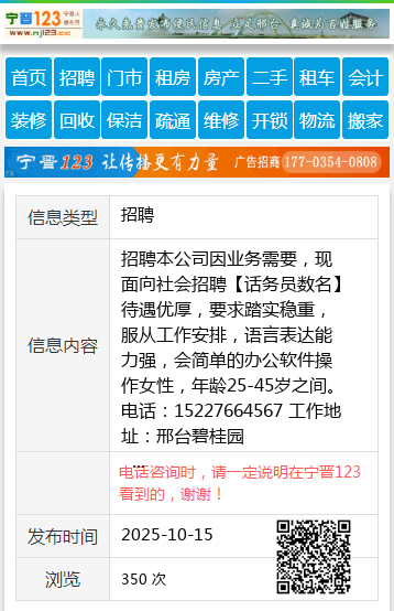 招聘本公司因业务需要,现面向社会招聘【话务员数名】待遇优厚,要求踏实稳重,服从工作安排,语言表达能力强,会简单的办公软件操作女性,年龄25-45岁之间。电话:15227664567 工作地址:邢台碧桂园 聘