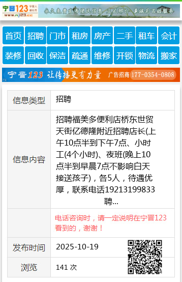 招聘福美多便利店桥东世贸天街亿德隆附近招聘店长(上午10点半到下午7点、小时工(4个小时)、夜班(晚上10点半到早晨7点不影响白天接送孩子),各5人,待遇优厚,联系电话19213199833 聘