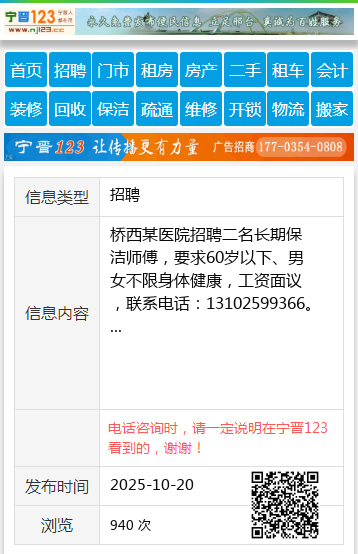 桥西某医院招聘二名长期保洁师傅,要求60岁以下、男女不限身体健康,工资面议,联系电话:13102599366。