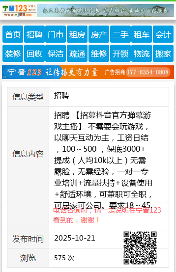 招聘 【招募抖音官方弹幕游戏主播】 不需要会玩游戏,以聊天互动为主,工资日结,100~500 ,保底3000+提成(人均10k以上)无需露脸,无需经验,一对一专业培训+流量扶持+设备使用+舒适环境,可兼职可全职,可居家可公司。要求18~45岁,善于互动,热爱表达!地址:万达广场南门对面 电话:15200168698(同微信) 聘 |