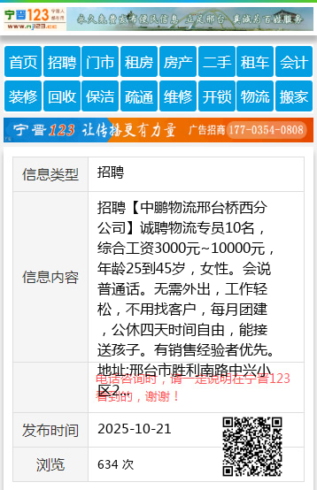 招聘【中鹏物流邢台桥西分公司】诚聘物流专员10名,综合工资3000元~10000元,年龄25到45岁,女性。会说普通话。无需外出,工作轻松,不用找客户,每月团建,公休四天时间自由,能接送孩子。有销售经验者优先。地址:邢台市胜利南路中兴小区2号楼2单元212(东户)。电话同微: 19933245550,19133993966 聘