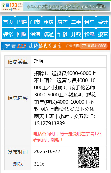 招聘1、送货员4000-6000上不封顶2、运营专员4000-10000上不封顶3、成手花艺师3000-5000上不封顶4、鲜花销售(店长)4000-10000上不封顶以上岗位45岁以下公休两天上班十小时,交五险 ☎:15127913889欢迎有梦想的您加入 聘