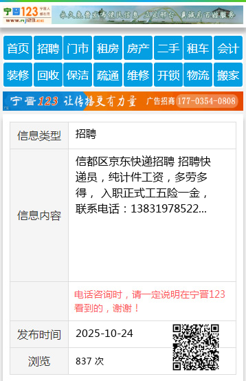 信都区京东快递招聘 招聘快递员,纯计件工资,多劳多得, 入职正式工五险一金,联系电话:13831978522 【电话咨询时,请一定说明在邢台123看到的,谢谢!】 |