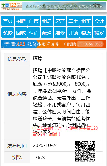 招聘【中鹏物流邢台桥西分公司】诚聘物流客服10名,底薪+提成3000元~8000元,年龄25到40岁,女性。会说普通话。无需外出,工作轻松,不用找客户,每月团建,公休四天时间自由,能接送孩子。有销售经验者优先。地址:邢台市胜利南路中兴小区2号楼2单元212(东户)。电话同微: 19933245550,19133993966 聘