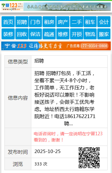 招聘 招聘打包员,手工活,坐着不累一天4-8个小时,工作简单,无工作压力,老板好说话可以兼职!不影响接送孩子,会做手工优先考虑。地址桥西太行路翰东学院附近!电话18617622171 聘