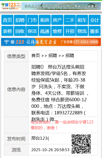 | 防骗提醒: | 邢台123(www.xingtai.wang)提醒您:手工活、网络兼职、刷单,都是骗子!凡以各种名义收取费用的都是骗子!找工作是往兜里挣钱,让你往外掏钱的都是骗子!异地招聘请提高警惕,谨防诈骗! |