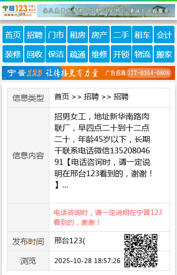 招男女工,地址新华南路肉联厂,早四点二十到十二点二十,年龄45岁以下,长期干联系电话微信13520804691 【电话咨询时,请一定说明在邢台123看到的,谢谢!】 |