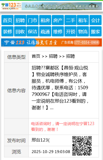 招聘??襄都区【昌恒·观山悦】物业诚聘秩序维护员,客服员,机电师傅,有公休,待遇优厚,联系电话:15097900967 【电话咨询时,请一定说明在邢台123看到的,谢谢!】 |
