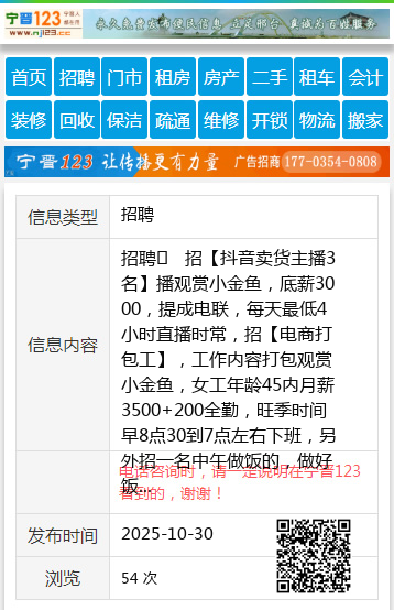 招聘 招【抖音卖货主播3名】播观赏小金鱼,底薪3000,提成电联,每天最低4小时直播时常,招【电商打包工】,工作内容打包观赏小金鱼,女工年龄45内月薪3500+200全勤,旺季时间早8点30到7点左右下班,另外招一名中午做饭的,做好饭就可以下班,家常便饭没有特殊要求,月薪1000+,电17531997717,地址团结路与滨江路交叉口,顺隆种植园 聘 |
