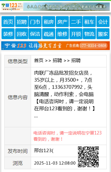 肉联厂冻品批发招女店员,35岁以上,月3500+,7点至6点,13363707992,头脑清醒,动作利索,会电脑 【电话咨询时,请一定说明在邢台123看到的,谢谢!】 |