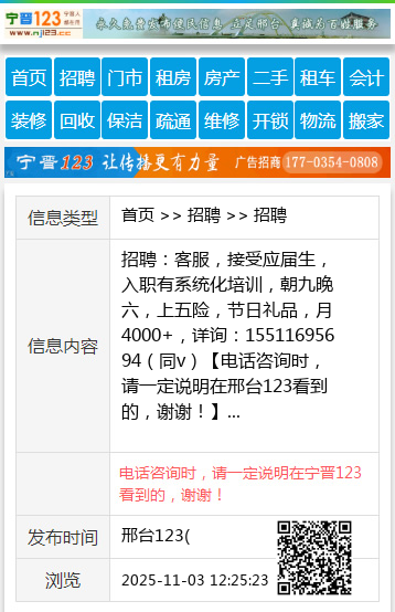 招聘:客服,接受应届生,入职有系统化培训,朝九晚六,上五险,节日礼品,月4000+,详询:15511695694(同v) 【电话咨询时,请一定说明在邢台123看到的,谢谢!】 |